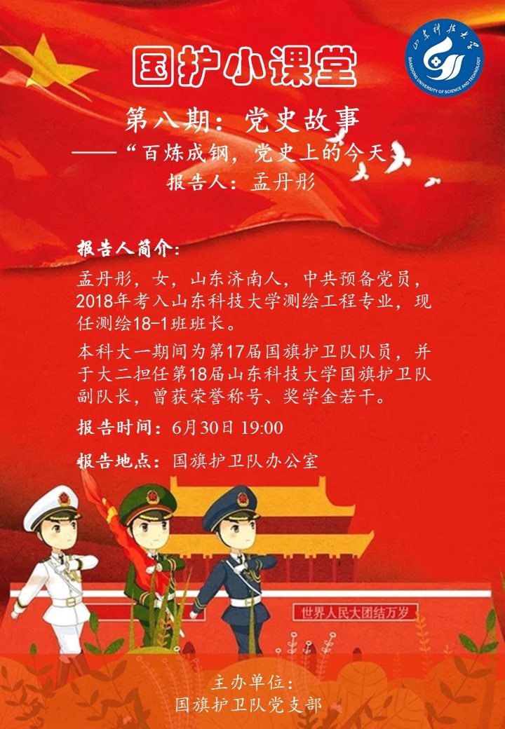 6月30日,为庆祝中国共产党成立100周年,MK体育官网国旗护卫队党支部开展国护小课堂第八期,支部全体党员同志参加。本次国护小课堂活动,由孟丹彤同志主讲,主要从以下两个方面讲述了中国共产党成立100年的历程。首...