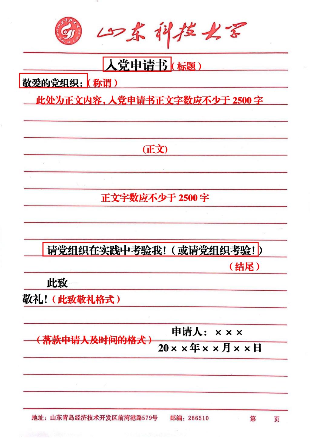 3.正文。主要内容包括以下方面:①为什么要入党,主要写自己对党的认识和入党动机。②个人在政治信念、成长经历和思想、学习、工作等方面的主要表现情况。③对待入党的态度和决心,今后努力方向以及如何以实际行动争取入党。正文一般不少于2500字。