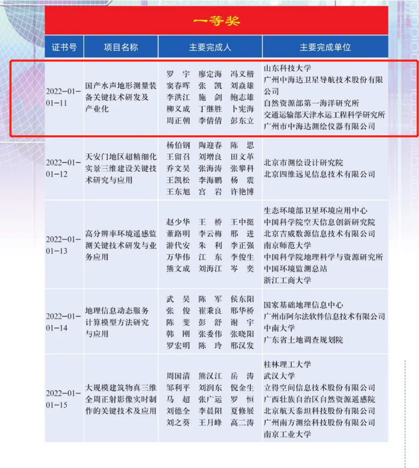 近日,中国测绘学会发布“2022年中国测绘科学技术奖励”评选公告,由公司罗宇教授主持,与广州中海达卫星导航技术股份有限公司、自然资源部第一海洋所、交通运输部天津水运工程科学研究所和广州市中海达测绘仪器有限公司共同完成的“国产水声地形测量装备关键技术研发及产业化”项目获得中国测绘科学技术奖一等奖。