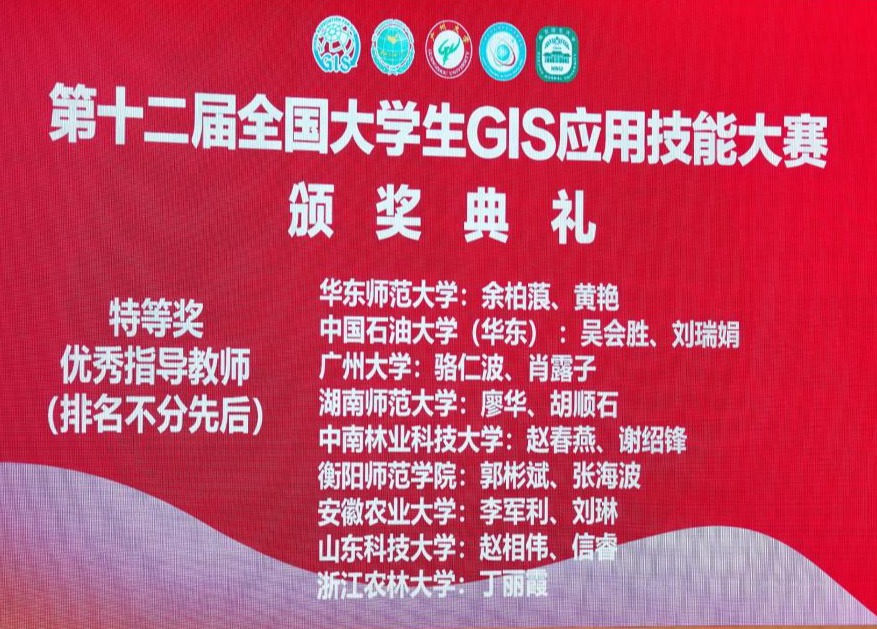 2023年12月2日-3日,第十二届全国老员工GIS应用技能大赛在广州大学举行,公司派出的比赛代表队经过层层筛选和激烈角逐,获得特等奖,赵相伟老师、信睿老师获评优秀指导教师,代表队成员是来自2021级地理信息科学专业的张恒瑞、张光泽、张成茁和钟亚妮四位同学。