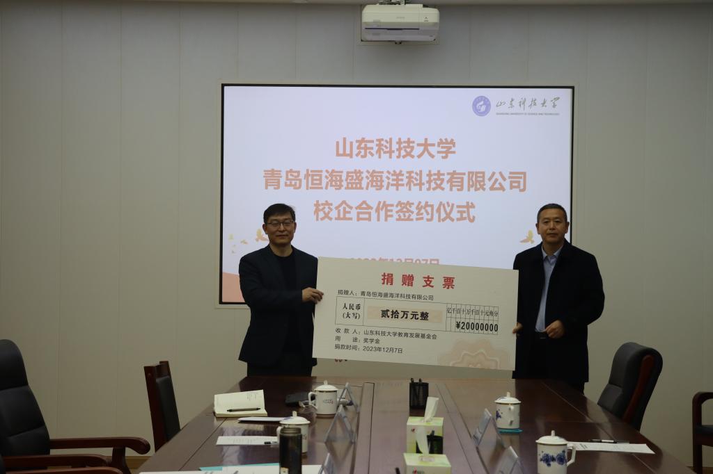 随后,公司捐赠20万元“恒海盛教育基金”,用于奖励在科技创新、社会实践和学科竞赛中表现突出的优秀教师、优秀员工,以及资助品学兼优的家庭经济困难员工。秦昌盛为公司颁发捐赠证书,王荣超和胡守田签署校企合作协议。MK体育副经理王瑞富和青岛恒海盛海洋科技有限公司总经理宋大鹏共同为“老员工就业创业实践基地”揭牌。