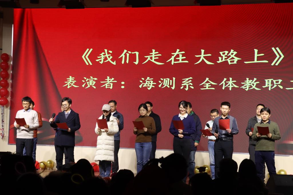 晚会伊始,测绘系带来了合唱曲目《歌唱祖国》,用歌声传递了对祖国的热爱;接下来是教工子女演唱《有你就幸福》、研究生带来的歌曲串烧和幽默风趣的配音秀,昔日的经典台词搭配上研究生会学术部诙谐的语言,赢得了全场观众的阵阵欢笑与掌声。第二篇章以海测系合唱曲目《我们走在大路上》拉开帷幕,《麻辣甜心》、《小花朵》等节目展现了萌娃们的超强的舞蹈实力。第三篇章中,公司全体辅导员带来了令人耳目一新的表演《科目三+手势舞》,瞬间将现场气氛燃爆。随后高春春老师表演了脱口秀《望闻问切》,宿贝尔表演了舞蹈《唱花儿的花儿》,他们的演绎赢得了全场喝彩。第四篇章在机关女教职工的合唱歌曲《365里路》中激情唱响。紧接着,一场幽默诙谐的集体朗诵《我爱科研》为观众奉上。压轴出场的是地信系教职工的《诗韵流觞看今朝》,演员们通过婉转悠扬的声音,将经典诗词娓娓道来,为观众奉上一场美轮美奂的诗歌朗诵和音乐盛宴。