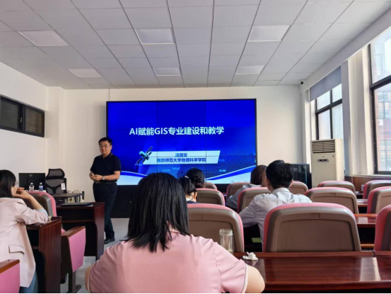 报告会上,汤国安教授从背景与时代特征、AI赋能GIS专业建设核心逻辑、AI赋能GIS公司产品实践路径、特色实践四个方面对AI赋能GIS专业建设、人才培养、公司产品等方面展开了详细介绍。