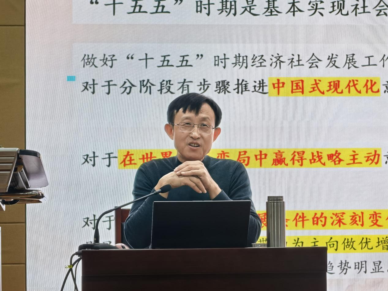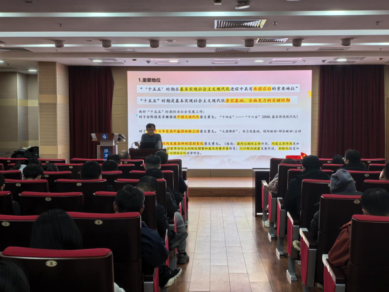孙绪民教授围绕全会召开的重大意义、核心内容以及全会精神的十大创新点等方面进行了系统阐释和深入解读。报告从第十五个五年规划的重要地位及面临环境,高水平自立自强的内涵特质,我国高水平自立自强的短板,高水平自立自强的战略路径等四个方面,系统阐释了“十五五”时期的历史方位和发展环境,明确了“十五五”时期经济社会发展的指导思想、遵循原则、主要目标、战略任务和重大举措。结合当前国内外形势与发展大局,深入分析了新时代新征程上高等教育工作者所肩负的使命责任。报告内容翔实、脉络清晰、论述深刻,既有理论高度,又紧密联系实际,对全体与会师生深化理解、推动工作具有重要的指导意义。