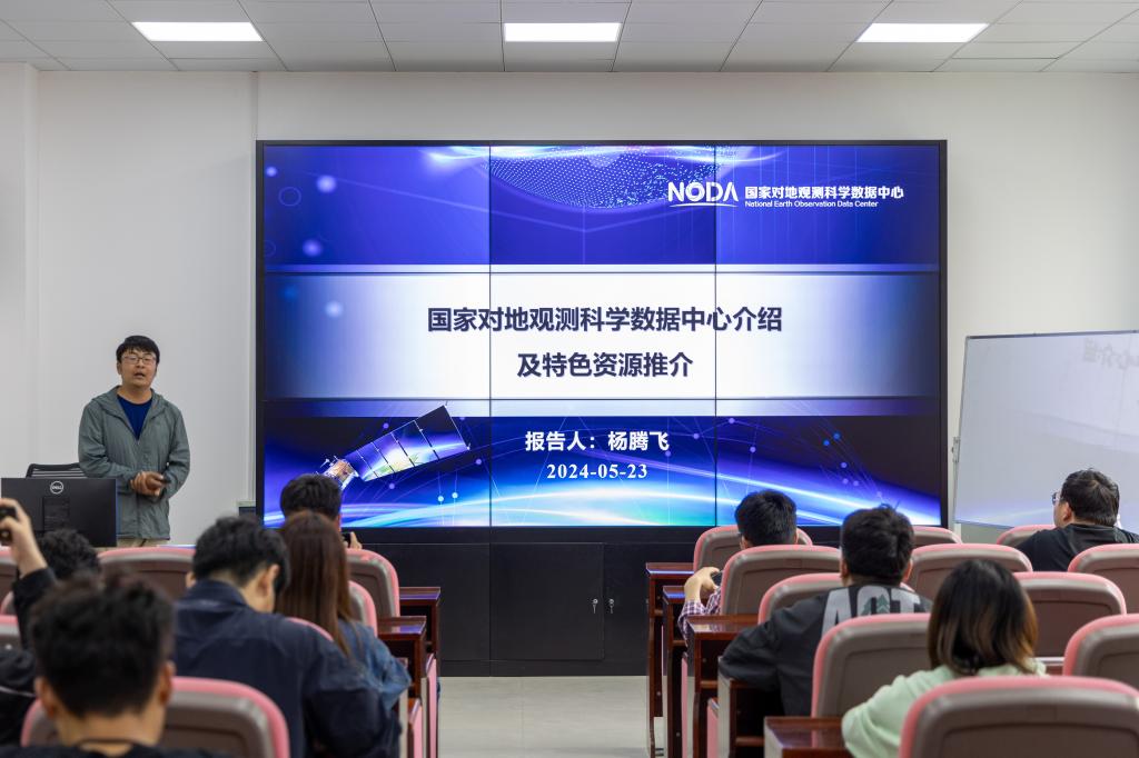 报告会上,杨腾飞博士从国家对地观测科学数据中心成立的背景、发展战略以及应用服务等内容展开,分析了新时代应对数据问题与挑战的思路和建立新型数据生态的方法。他对如何获取国家对地观测科学数据中心的重要开放资源进行了普及,并现场回答了师生提问。