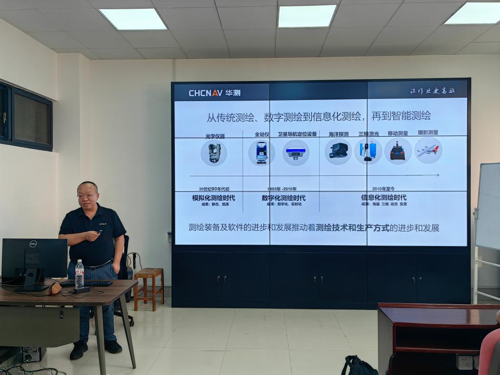 胡炜讲解了从模拟测绘到数字测绘、信息测绘再到智能测绘的发展过程,并从RTK测量系统、激光雷达系统、无人机测绘系统、无人船测量系统、监测集成系统、农机导航自动驾驶系统、数字施工管理系统、组合导航系统等方面对当前测绘作业中的智能装备进行了详细介绍。在报告过程中,胡炜将讲解与图像、视频等多种方式结合,为与会师生展示各种智能装备的作业原理、作业流程,整场报告生动形象,引人入胜。会后,胡炜与参会员工进行了现场交流,对大家的提问做出了详细解答。