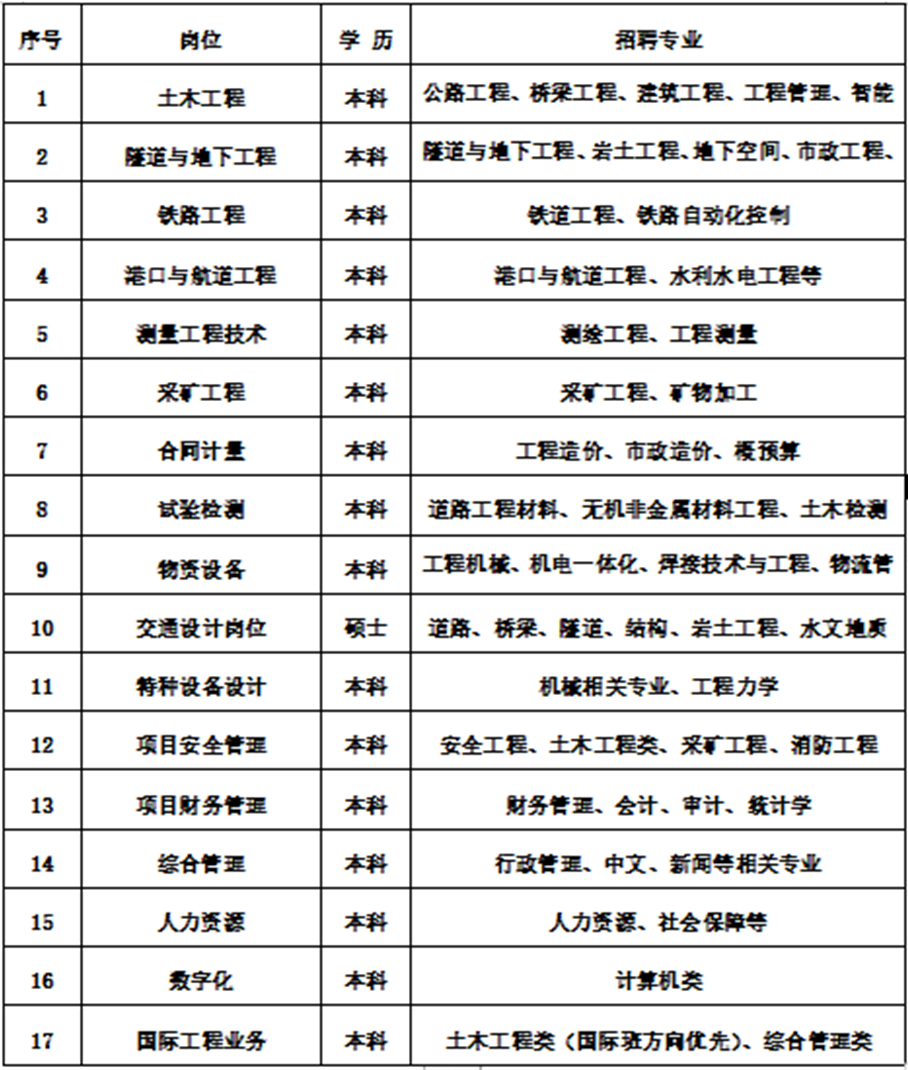 因公路桥梁、铁路、港航、地下工程、房建、装备、国际工程施工及设计等业务发展需要,诚聘各类专业应届毕业生,专业岗位需求如下: