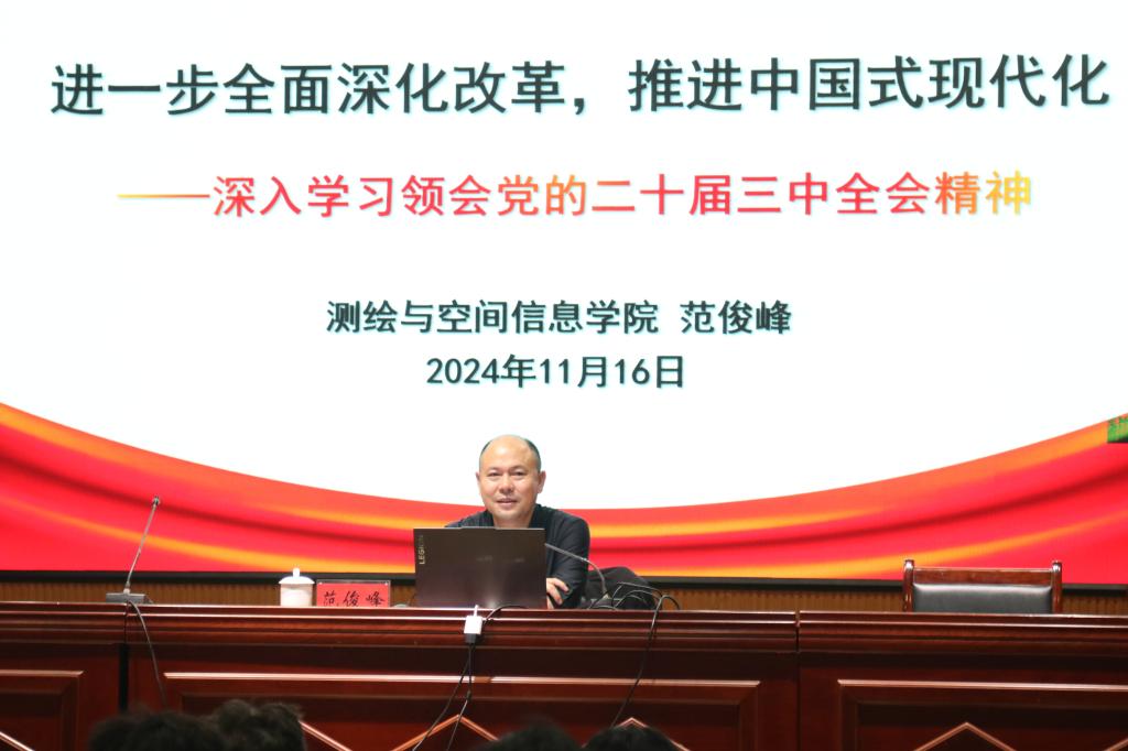 为深入学习贯彻党的二十届三中全会精神,帮助入党积极分子深入理解党的理论成果和路线方针,强化思想政治基础。11月16日,​公司党委书记范俊峰为测绘、地科公司第34期入党积极分子作“进一步全面深化改革,推进中国式现代化——深入学习领会党的二十届三中全会精神”专题辅导报告。