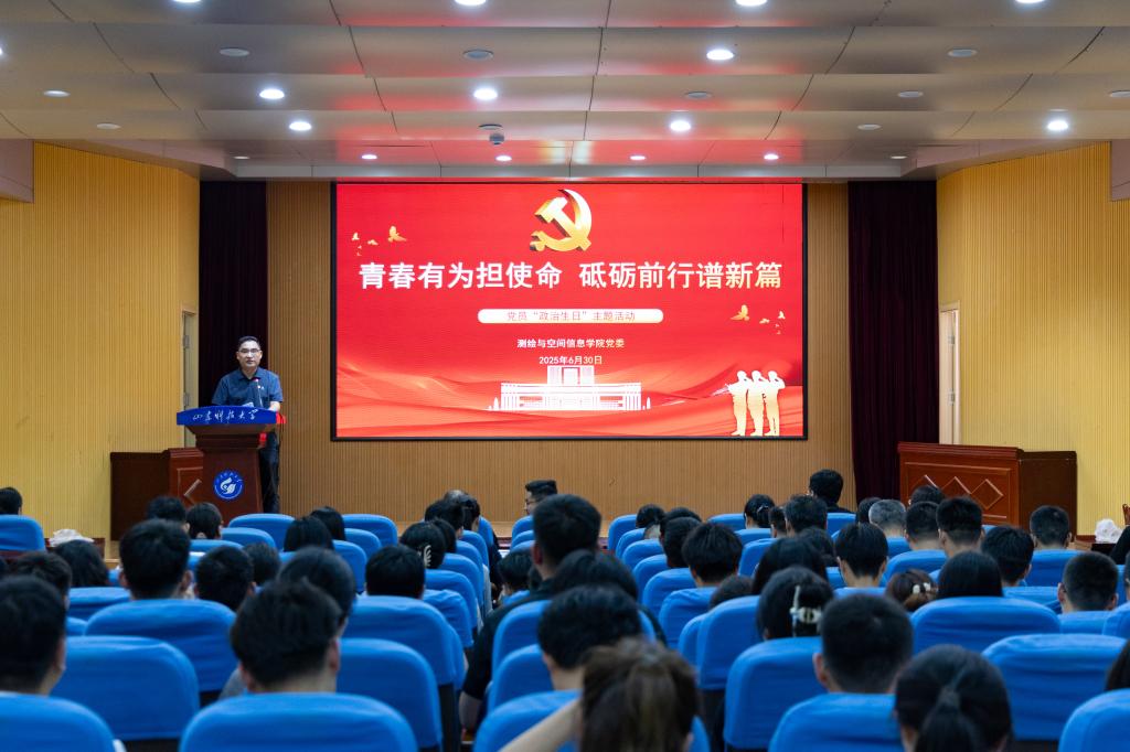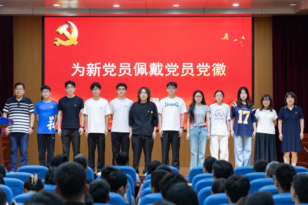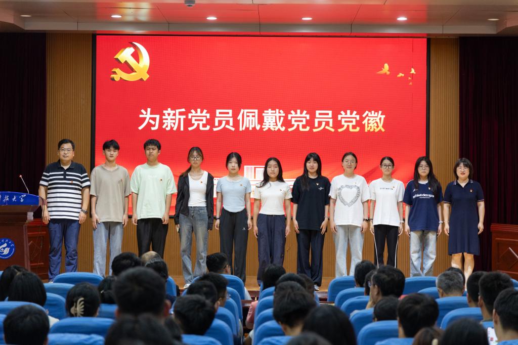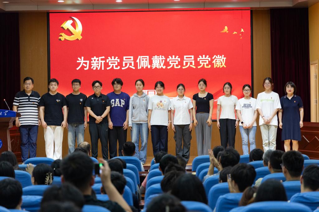 “我志愿加入中国共产党……”,在鲜艳的党旗下,地理学和电子信息专业研究生党支部书记韩冰带领新党员宣誓、全体党员重温入党誓词。铿锵有力的誓言在报告厅中回荡,燃起了广大党员践行诺言、砥砺奋进的激情与担当。