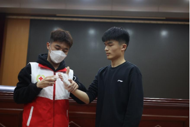 宣讲团成员通过理论宣讲与实践演绎相结合的方式,使同学们学习了解应急救护与安全避险知识。培训从血压测量、头肩胸部止血包扎、心脏骤停应对、心肺复苏及其他注意事项等方面进行知识讲解与现场实践。在实践环节,同学们热情参与其中,在宣讲团成员指导下完成各类演示操作。