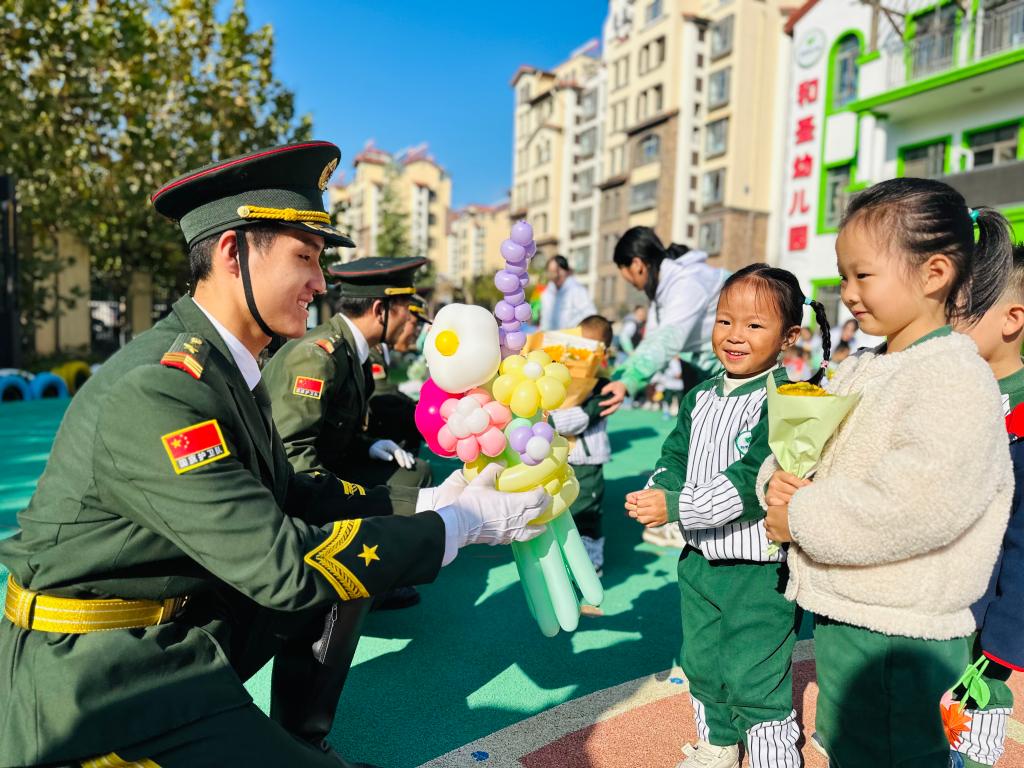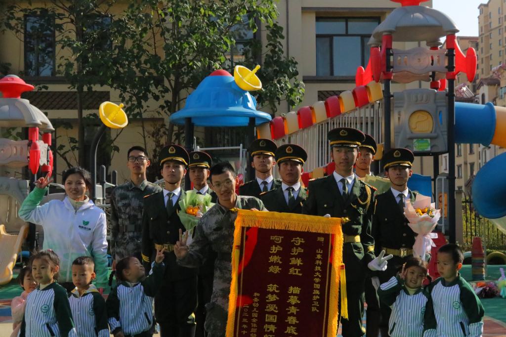 升旗仪式结束后,国旗护卫队队员为小朋友们进行国旗知识宣讲,讲解中,小朋友们认真倾听,加深了对国旗的认识,增强了爱国意识,也更加懂得要爱护国旗,尊重国旗,要为国旗争光、为祖国争光!活动现场,国旗护卫队队员向小朋友们讲解了第一面国旗诞生的故事,还示范了敬礼、正步走等,小朋友们沉浸体验,开心交流。活动结束后,和圣幼儿园的小朋友们给国旗护卫队准备了精心的小礼物并送上锦旗,队员们和孩子们亲切互动,合影留念。