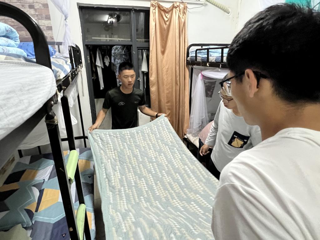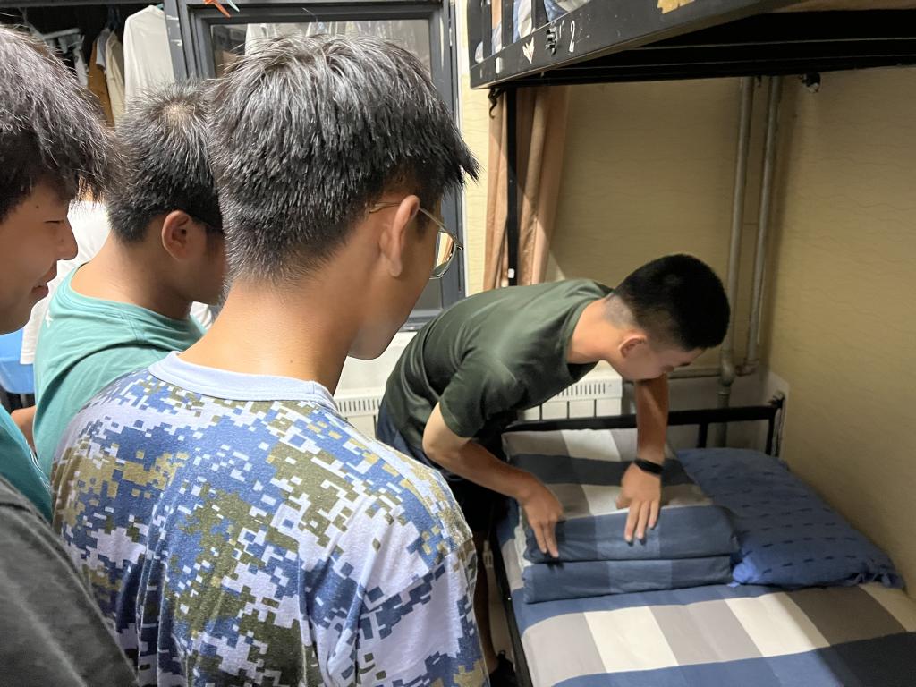 出门看队伍,进门看内务,寝室内务整理,是军训的必修课之一。为加深新生对军训内务的了解,教官们对宿舍物品的摆放、宿舍卫生的要求、床铺的基本整理进行了手把手的指导。“一叠、一折、朝里、向右”,同学们认真学习并积极实践,不放过每一个角落、每一处细节。