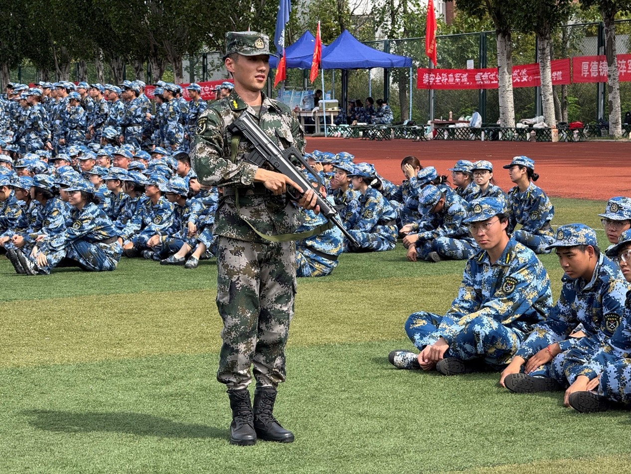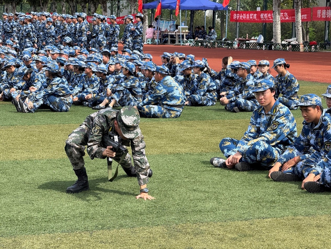 金秋时节,天朗气清,高地操场上旌旗微动,2025级新生军训正在如火如荼进行。伴随着清晨的阳光,测绘学子们开始了防毒面具佩戴的学习以及95式的操作。
