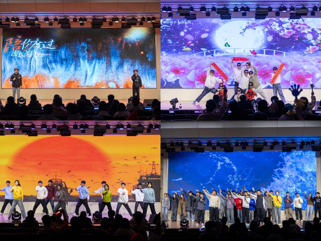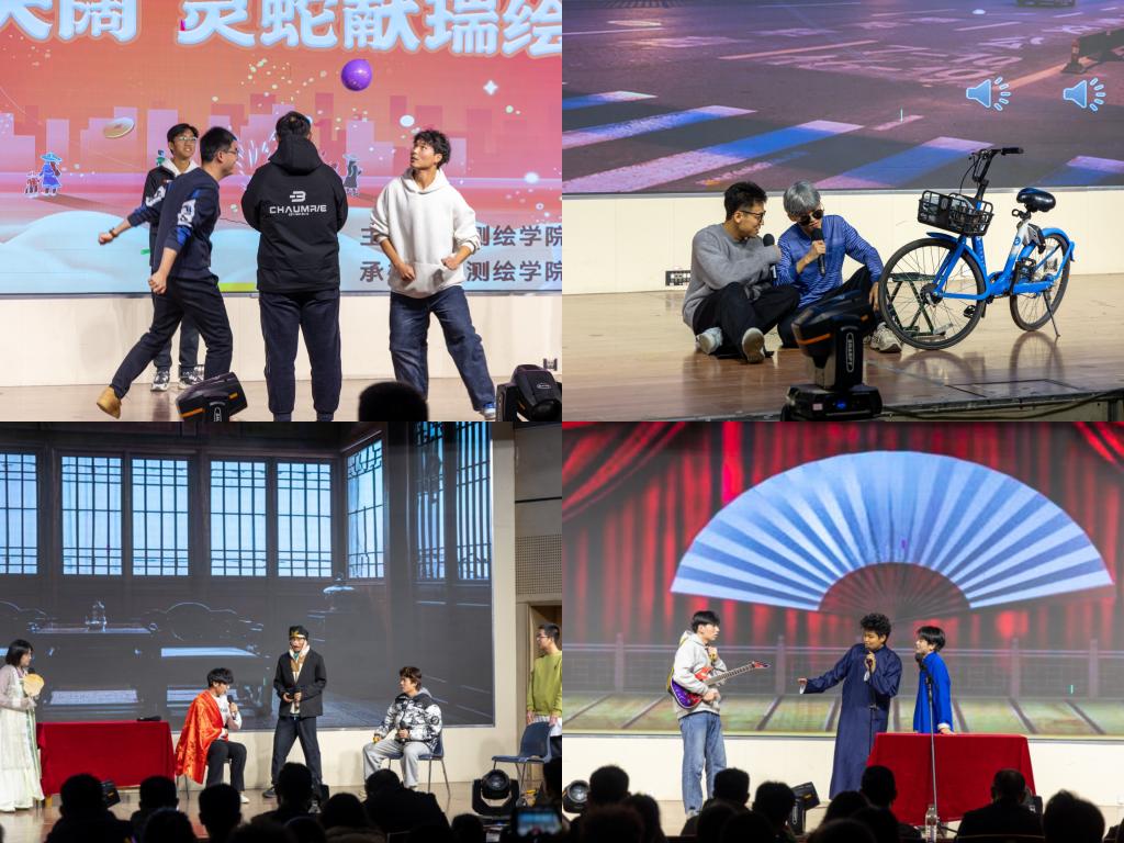 会以第一篇章“跃动当燃”活力开启,大艺团器乐队以一曲《想去海边》率先奏响青春旋律,大艺团舞蹈队的《whiplash》搭配地信一班的《青海摇》,用动感的节奏与激情的表演点燃了现场气氛,测绘五班带来的歌曲《罗生门》,也将现场气氛推至高潮。随着中场游戏的欢乐结束,第二篇章“笑靥常开”欢乐呈现,地信二班的《碰瓷》、学科部的《西游记——四圣试禅心》以及新闻工作室的《测绘传奇》,凭借幽默风趣的情节与表演引得观众笑声不断、掌声雷动。