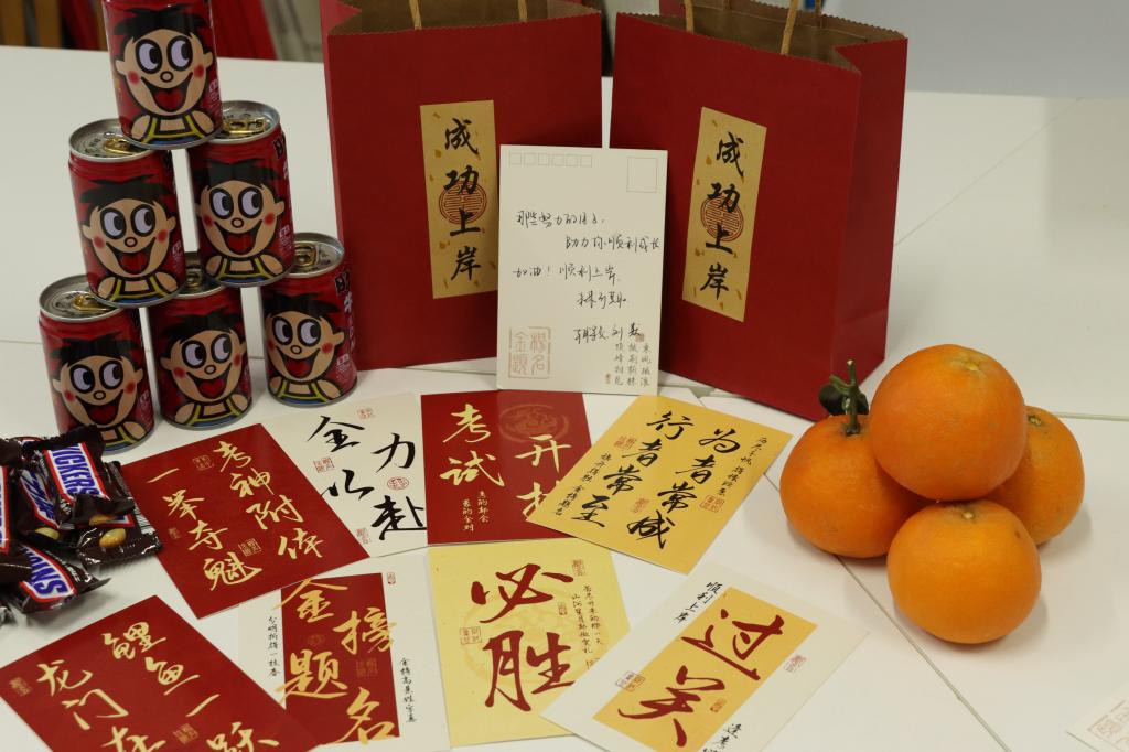 公司为考研学子精心准备“成功上岸”暖心礼袋,每一份礼袋中都有辅导员老师手写考研祝福贺卡,寄托着公司对考研学子们的亲切关怀和殷殷祝福。橙子代表着心想事“橙”,巧克力寓意“力”跃龙门,旺仔牛奶祝福同学们一“旺”到底,期望同学们在考场上展现最出色的自己。