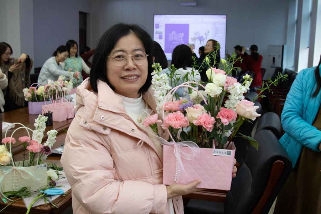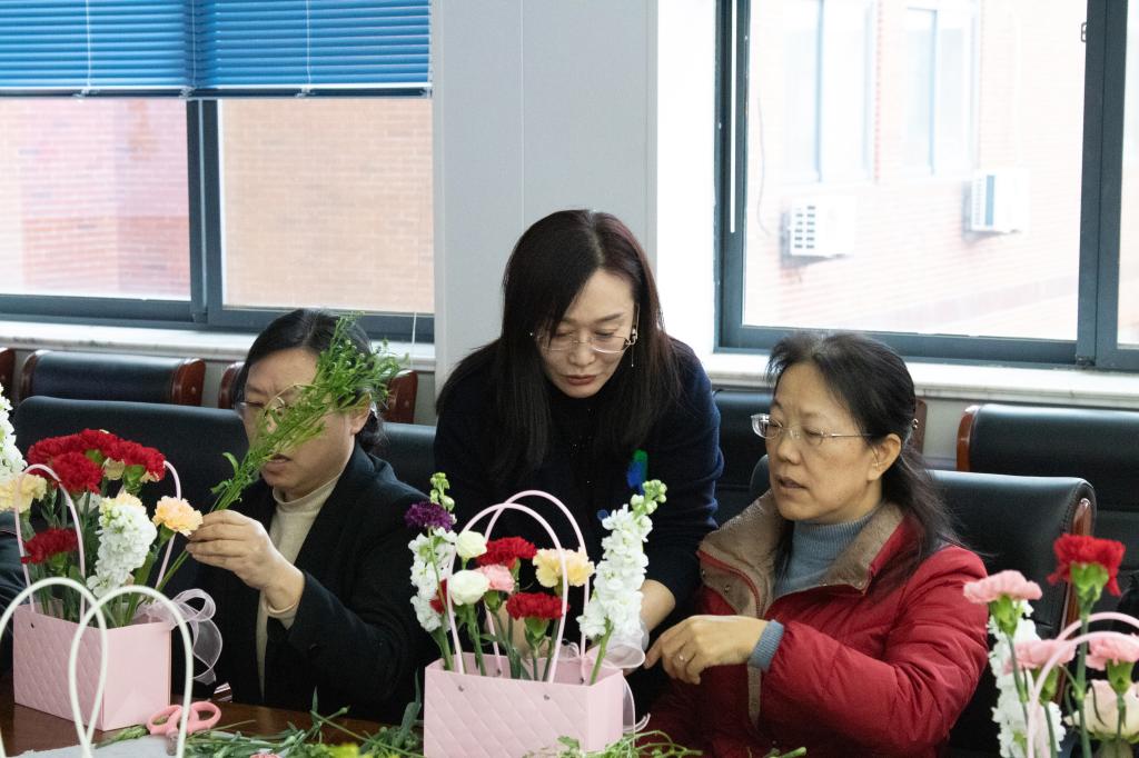 “这枝康乃馨插这里好看吗?”“这儿配朵粉红色的漂亮吧!”活动现场,在花艺老师的指导下,女教职工们在学习鲜花品种和寓意、枝叶捆绑方式、色彩搭配形式、插花步骤流程之后,开启了轻松愉快的插花之旅。她们用心构思、精心创作,小心翼翼的将花朵和配花精巧融合,在角度、高度、层次等方面不断尝试,将鲜花和配花随心搭配在一起,一篮篮错落有致、独具韵味的插花作品新鲜出炉,大家一边创作,一边分享生活点滴,交流插花心得,沉浸在温馨的氛围中。