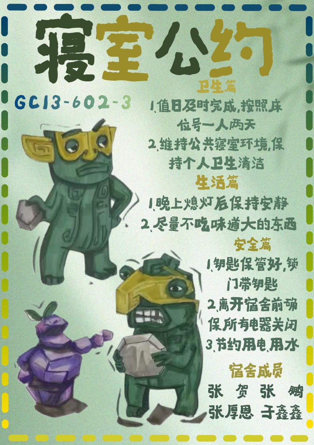 在公约设计过程中,各宿舍成员围绕公寓安全、卫生规范、作息制度、人际交往等内容展开深入讨论,集思广益,最终创作出各具特色的宿舍文明公约。这些公约不仅明确了宿舍成员的行为准则,也为构建温馨和谐的生活环境提供了制度保障。公约制定完成后,各宿舍立即着手整改落实,宿舍整体风貌焕然一新,展现出积极向上的精神面貌。经评审,最终评选出一等奖5个、二等奖8个、三等奖13个。