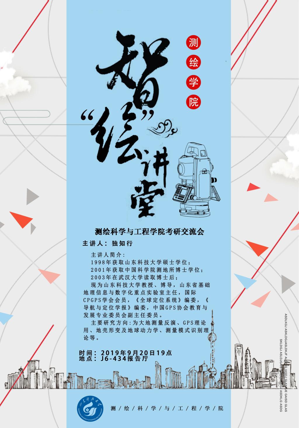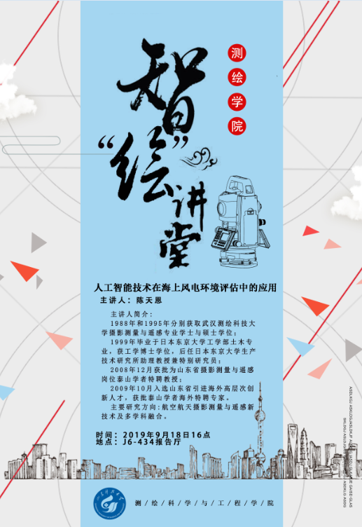 2019年9月18日下午,测绘科4学与工程公司智“绘”讲堂第十期在J6楼434学术报告厅成功举办。本期智“绘”讲堂邀请到泰山学者海外特聘专家陈天恩教授,为大家作题为“人工智能技术在海上风电环境评估中的应用”的讲座,...