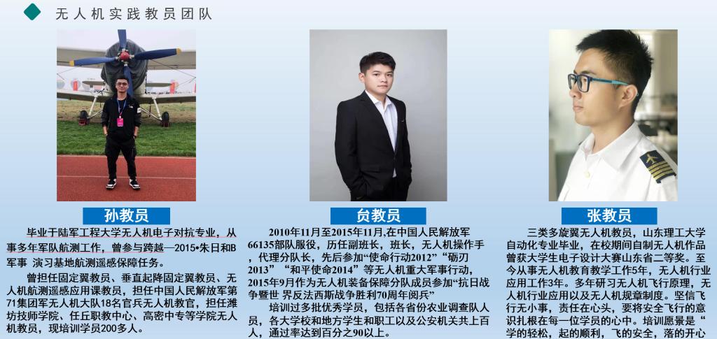 睿飞无人机培训公司依托山东省高水平大学MK体育官网和山东省百强企业瑞源集团联合共建,利用二者的学科优势和科研成果以及在时空地理信息技术的研究、开发与应用,引领无人机应用培训从前沿理论到技术应用。