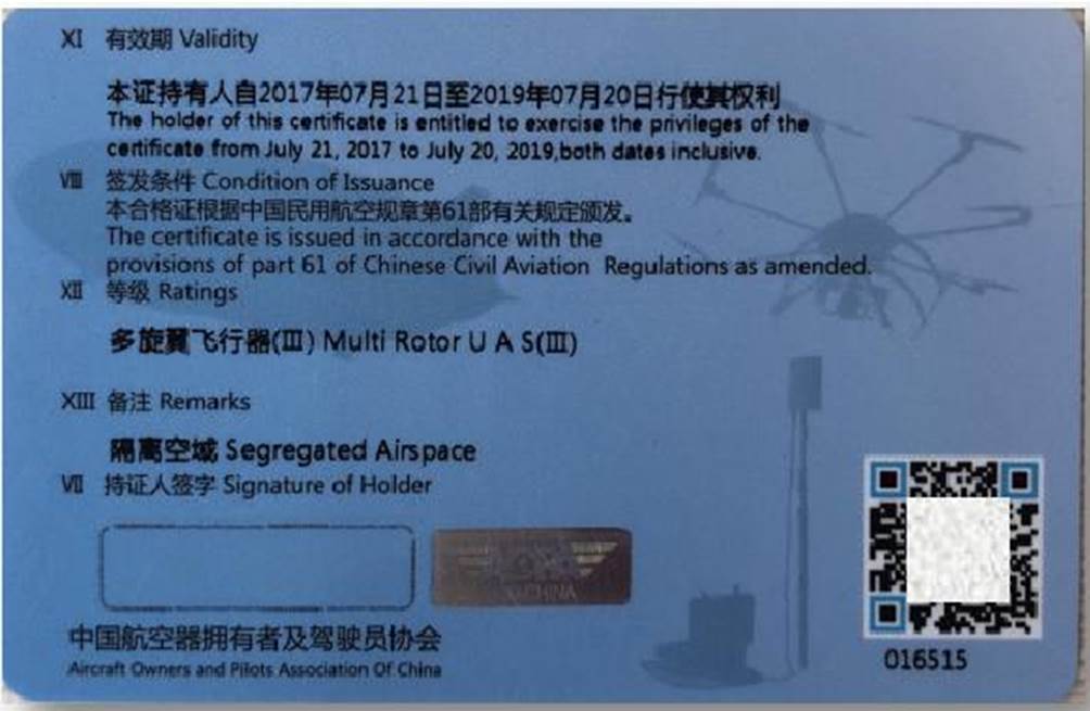 公司学员经理论和实践考试合格后,可以获得三个证书,分别是由中国民用航空局颁发的民航局“无人机驾驶员云执照”,由中国航空器拥有者及驾驶员协会(AOPA)颁发的“AOPA无人机驾驶员合格证”,和由MK体育官网颁发的MK体育官网无人机测绘结业证书。其中民航无人机驾驶员执照和AOPA无人机驾驶员合格证等级高,含金量大,“一考双证”是我们睿飞无人机培训公司的巨大优势。