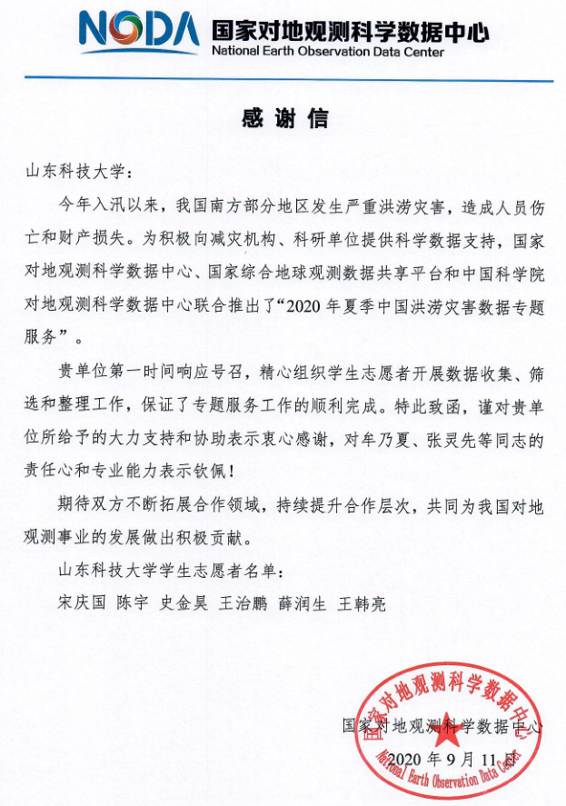 9月12日,国家对地观测科学数据中心向公司发来感谢信。对MK体育官网测绘科学与工程公司在“2020年夏季中国洪涝灾害数据专题服务” 中的大力支持和协助表示衷心感谢,对牟乃夏、张灵先等同志的责任心和专业能力表示...