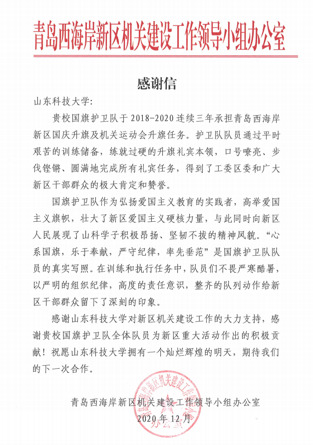 日前,公司收到来自青岛西海岸新区机关建设工作领导小组办公室发来的《感谢信》。信中,对公司国旗护卫队连续三年承担青岛西海岸新区国庆升旗及机关运动会升旗任务表示感谢,对护卫队员表现出的过硬本领和优良品格给...