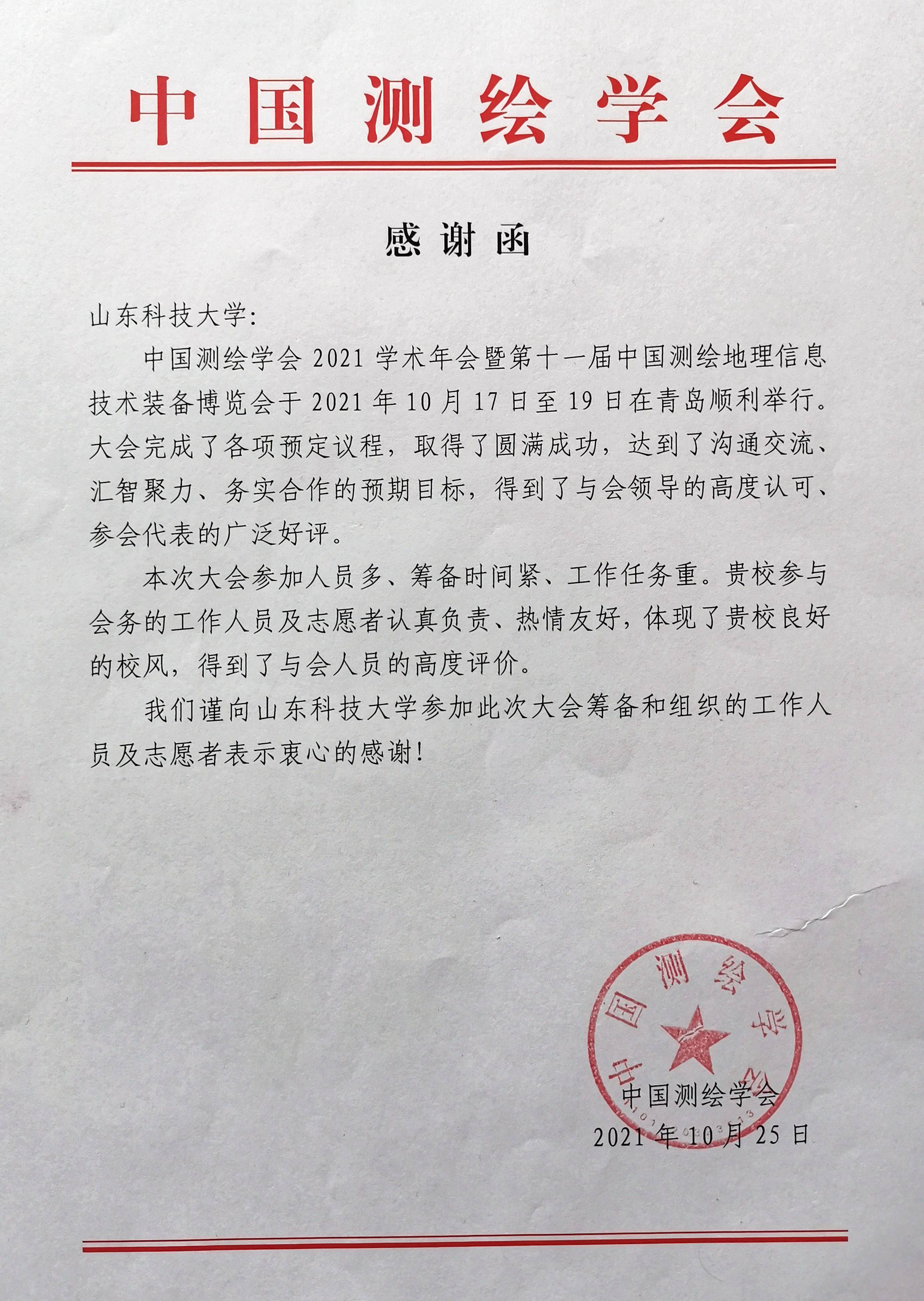近日,公司收到中国测绘学会发来的感谢函,信中对公司师生积极参与中国测绘学会2021学术年会暨第十一届中国测绘地理信息技术装备博览会志愿服务工作表示感谢,并给予了高度的评价,科大学子展现了良好的精神风貌,以...